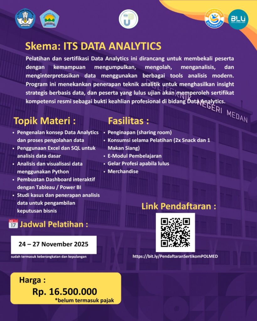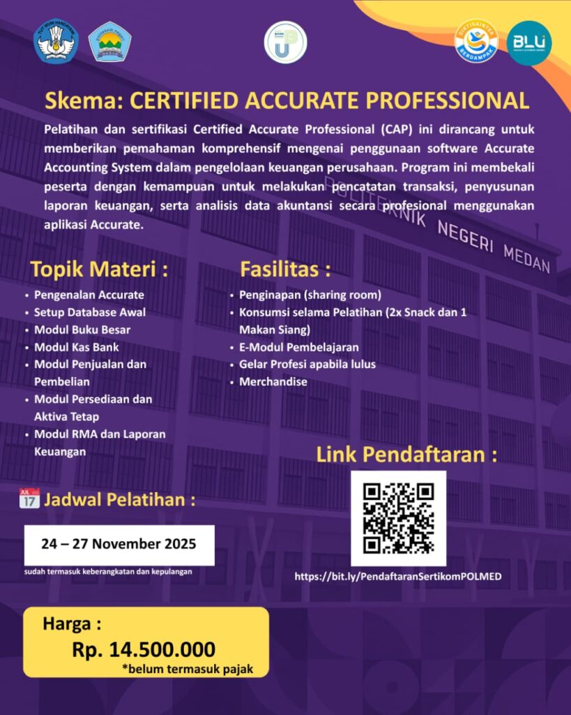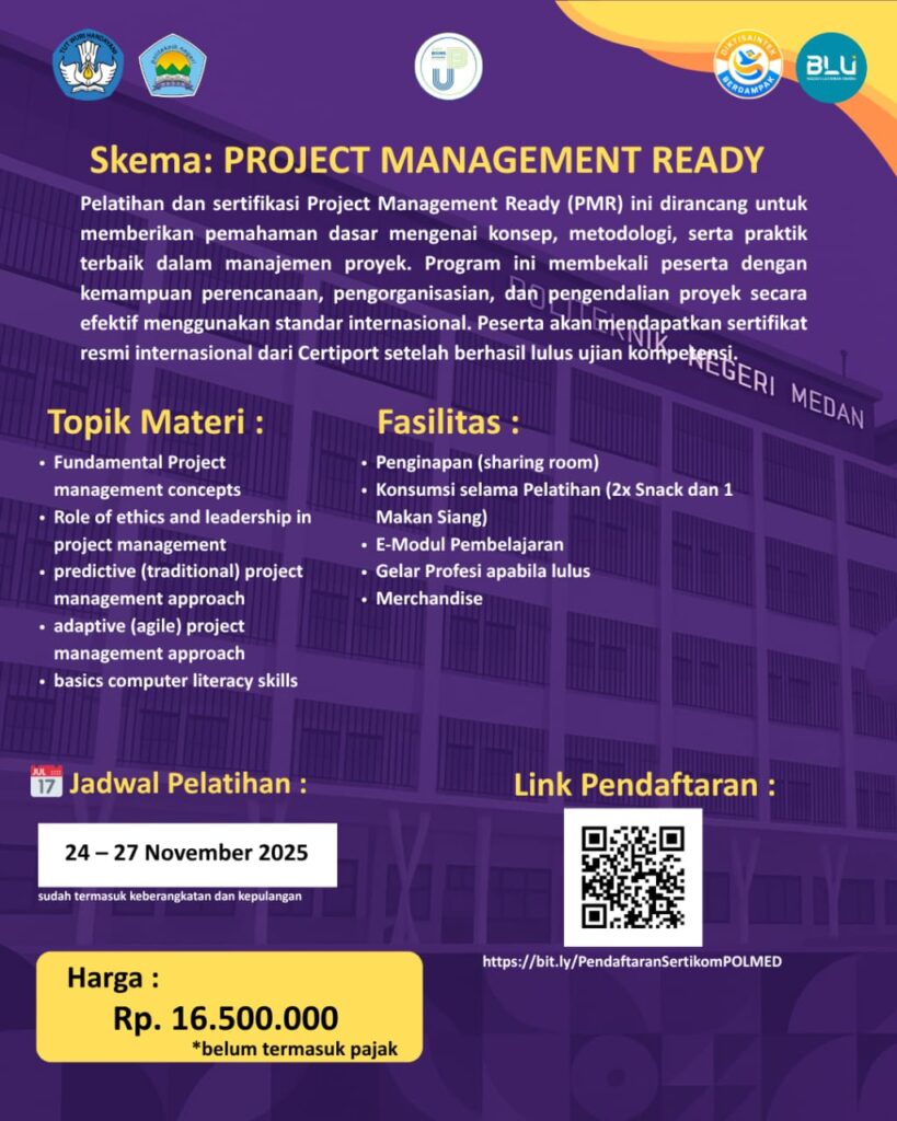 Politeknik Negeri Medan kembali membuka Program Pelatihan dan Sertifikasi Profesi 2025 bagi mahasiswa, alumni, maupun masyarakat umum yang ingin meningkatkan kompetensi dan mendapatkan sertifikat resmi nasional maupun internasional.